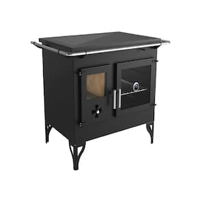 Fogão à lenha dupla combustão, aquece 245m³, fabricado em aço carbono, porta de vidro cerâmico, chapa de vidro cerâmico, divisória em aço inox de 47L.