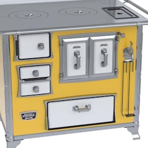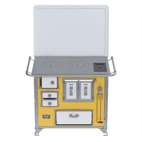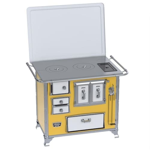 Fogão a lenha com chapa de ferro fundido polido, varão de proteção cromado, caldeira de 4L, forno de 32L com prateleira regulável, estufa de 85L, porta da fornalha e da estufa em aço esmaltado.Tipo