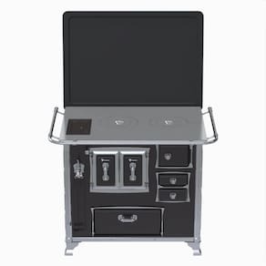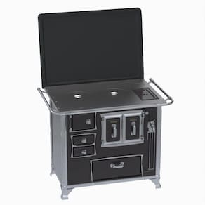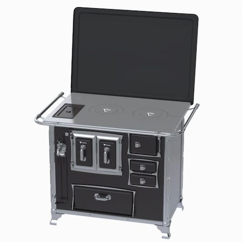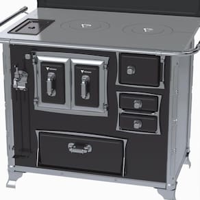 Fogão a lenha com chapa de ferro fundido polido, varão de proteção em aço cromado, caldeira, forno com prateleira regulável, estufa e gaveta de cinzas. Revestimento em esmalte preto com detalhes cromados.Tipo