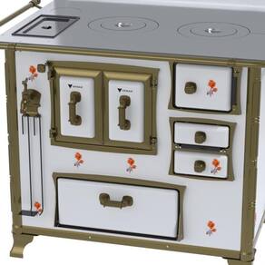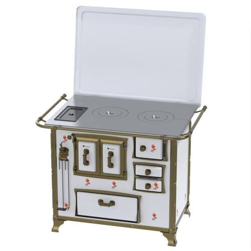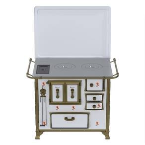 Fogão a lenha com chapa de ferro fundido polido, varão de proteção com acabamento em ouro envelhecido, caldeira, fornalha com tijolos pré-moldados, forno e estufa.Tipo
