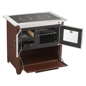 Fogão a lenha Hidro Prime Glass N2 com forno de 40 litros, chapa vitrocerâmica, tijolos refratários e caixa de lenha integrada.Tipo