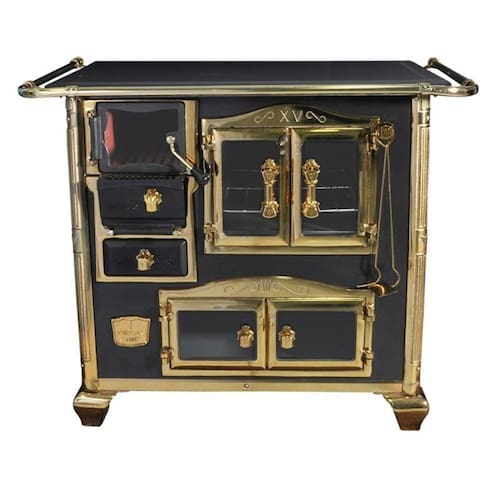 Características Gerais do produto Fogão a lenha cometros chapa de ferro fundido polido, varão de proteção emetros tubo de aço cometros acabametrosento emetros Yellow Gold, porta da fornalha cometros vidro vitrocerâmetrosico, forno cometros prateleira regulável e estufa. Design Séc. XV cometros acabametrosento emetros Yellow Gold.