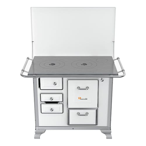 Fogão a lenha número 1 com gabinete, chapa de ferro fundido polida, com tampa e pés pintados em alumínio. Ideal para ambientes charmosos e elegantes.