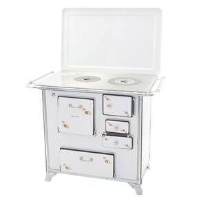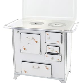 O Fogão a Lenha Número 02 Gabinete modelo Tradicional conta com corpo e forno totalmente em aço carbono com acabamento esmaltado a fogo na pintura Branca com Estampa Florida. Seus pés são em ferro fundido com pintura em alumínio, contando também com cantoneiras em aço inox e guarnições em ferro fundido cromado garantindo qualidade exclusiva e um ótimo acabamento no seu Fogão a Lenha.