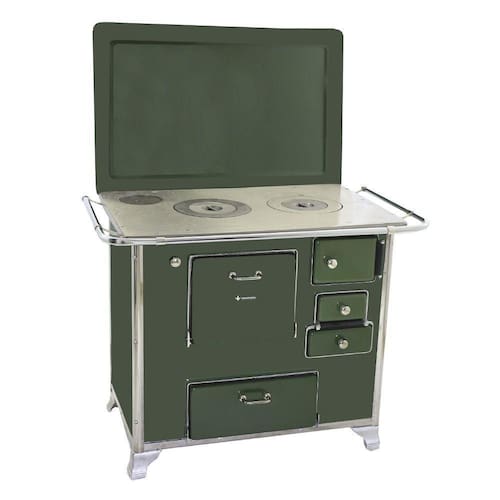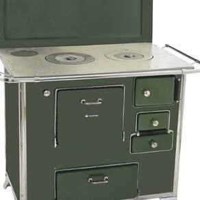 O Fogão a Lenha Número 02 Gabinete Modelo Tradicional conta com corpo e forno totalmente em aço carbono com acabamento esmaltado a fogo na pintura Verde. Seus pés são em ferro fundido com pintura em alumínio, contando também com cantoneiras em aço inox e guarnições em ferro fundido cromado garantindo qualidade exclusiva e um ótimo acabamento no seu Fogão a Lenha.
