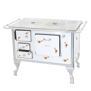 O Fogão a Lenha 02 conta com corpo e forno totalmente em aço carbono com acabamento esmaltado a fogo na pintura Branca. Seus pés são em ferro fundido com pintura em alumínio, contando também com cantoneiras em aço inox e guarnições em ferro fundido cromado garantindo qualidade exclusiva e um ótimo acabamento no seu Fogão a Lenha com estampa florida.