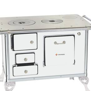 Fogão a lenha tradicional com corpo e forno em aço carbono esmaltado. Pés em ferro fundido. Chapa em ferro fundido com super polimento. Saída da chaminé direita.Tipo