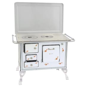 O Fogão a Lenha 01 conta com corpo e forno totalmente em aço carbono com acabamento esmaltado a fogo na pintura Branca. Seus pés são em ferro fundido com pintura em alumínio, contando também com cantoneiras em aço inox e guarnições em ferro fundido cromado garantindo qualidade exclusiva e um ótimo acabamento no seu Fogão a Lenha com estampa florida.