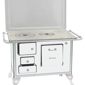 O Fogão a Lenha 02 conta com corpo e forno totalmente em aço carbono com acabamento esmaltado a fogo na pintura Branca. Seus pés são em ferro fundido com pintura em alumínio, contando também com cantoneiras em aço inox e guarnições em ferro fundido cromado garantindo qualidade exclusiva e um ótimo acabamento no seu Fogão a Lenha.