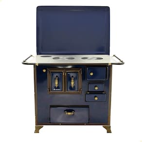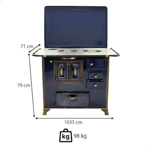 Fogão a lenha com chapa em ferro fundido super polido, corpo e forno em aço carbono esmaltado. Pés em ferro fundido modelo rústico com acabamento em ouro envelhecido. Puxador e escoras do varão em Zamak com acabamento em ouro envelhecido. Varões em tubo de aço com acabamento em ouro envelhecido. Guarnições em ferro fundido com acabamento em ouro envelhecido. Forno com sistema de abertura de porta dupla. Possui compartimento inferior para armazenagem da lenha, mantendo-a seca. Modelo acompanha tampa.Tipo