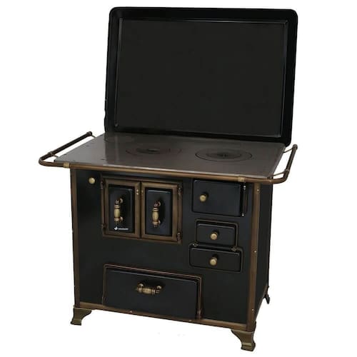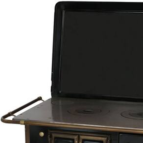 Chapa em ferro fundido com super polimento e maior dimensão; Pés em ferro fundido modelo rústico com acabamento em ouro envelhecido; Corpo e forno do fogão totalmente em aço carbono com acabamento esmaltado; Puxador e escoras do varão em Zamak com acabamento em ouro envelhecido; Varões em tubo de aço com acabamento em ouro envelhecido; Guarnições em ferro fundido com acabamento em ouro envelhecido; Modelo acompanha tampa; Forno com sistema de abertura de porta dupla; Modelo com conceito de antiguidade; Possui compartimento inferior para armazenagem da lenha, mantendo-a seca.Tipo