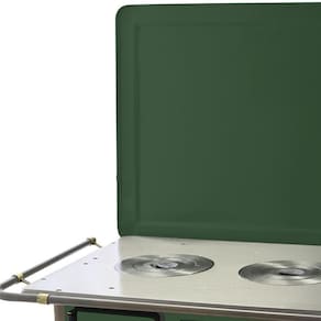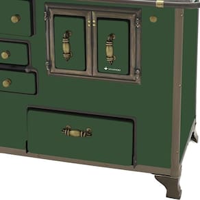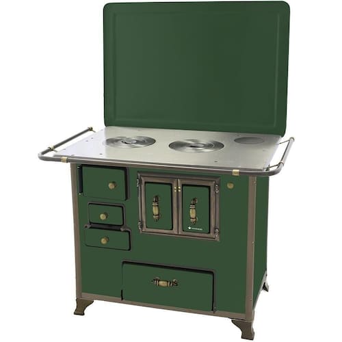 Chapa em ferro fundido com super polimento e maior dimensão; Pés em ferro fundido modelo rústico com acabamento em ouro envelhecido; Corpo e forno do fogão totalmente em aço carbono com acabamento esmaltado; Puxador e escoras do varão em Zamak com acabamento em ouro envelhecido; Varões em tubo de aço com acabamento em ouro envelhecido; Guarnições em ferro fundido com acabamento em ouro envelhecido; Modelo acompanha tampa; Forno com sistema de abertura de porta dupla; Modelo com conceito de antiguidade; Possui compartimento inferior para armazenagem da lenha, mantendo-a seca.Tipo