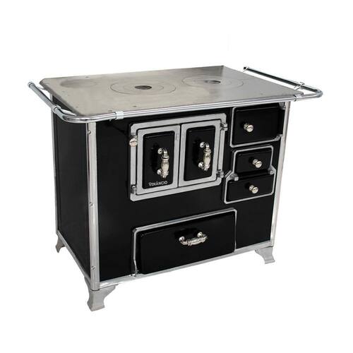 O Fogão a Lenha N2 da Venâncio conta com uma estrutura em aço carbono com acabamento esmaltado a fogo. Seus pés são em ferro fundido com pintura em alumínio, inclui também cantoneiras em aço inox e guarnições em ferro fundido cromado proporcionando qualidade exclusiva e um excelente acabamento.