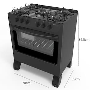 Este modelo possui 1 queimador tripla chama de 3000W e 4 queimadores de 2000W, além de suporte de trempe esmaltado que não risca, pés altos de 130 mm, manípulos anatômicos e forno com sistema Easy Clean, tornando o uso diário mais funcional e seguro. Seu acabamento preto agrega sofisticação à sua cozinha.