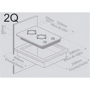 O cooktop possui superfície em vidro temperado de 6 mm, dois queimadores e acendimento automático. O modelo é indicado para instalação em nichos compatíveis e operação com GLP, podendo ser convertido para gás natural por assistência técnica autorizada.