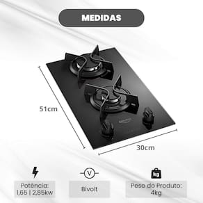 Especificações Técnicas: - Marca: Dako - Linha: Supreme - Cor: Preto - Voltagem: Bivolt - Tipo: Cooktop à Gás - Acendimento: Superautomático - Potência: 1,65 kW (convencional) e 2,85 kW (Mega Chama) - Mesa: Vidro temperado ultra resistente - Grades: Ferro fundido com 4 pontos de apoio - Eficiência energética: Classe A - Peso: 4 kg