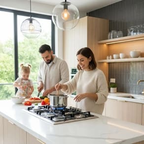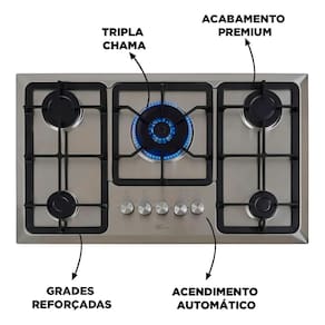 Cooktop de embutir com cinco queimadores, mesa em aço inox escovado e acendimento superautomático. O modelo possui queimador tripla chama, trempes em ferro fundido e compatibilidade com GLP ou GN (saída de fábrica em GLP).