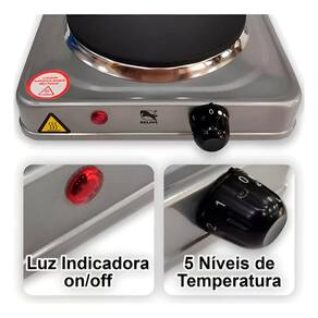 Fogão Cooktop Elétrico Portátil 1 Boca 1000W. Ideal para viagens, camping e cozinha. Compacto, funcional e fácil de usar. Possui 5 níveis de temperatura ajustáveis. Conta com luz indicadora on/off e sistema de desligamento automático.Luz de calor residual