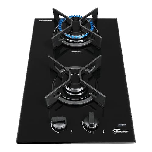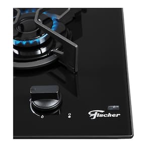 Mesa em vidro temperado preto, trempes Iron esmaltadas, queimadores italianos SABAF, acendimento superautomático, acabamento EasyClean.Luz de calor residual