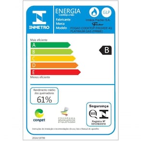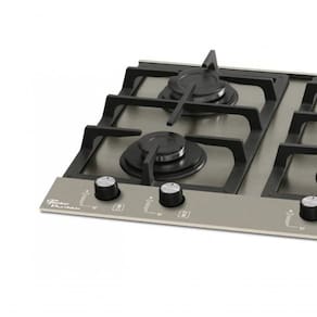 Fogão Cooktop Fischer 4 Bocas Platinium Prime Escovado 20874-51521 Fogão Cooktop Fischer 4 bocas Platinium Prime Escovado 20874-51521 Bivolt - Características Gerais do Produto: - Acendimento: Superautomático - Classificação eficiência energética: B - Consumo de gás: 0,691 Kg/h - Corrente: 0,04A (127V); 0,085A (220V) - Dimensões da embalagem (cm): A: 15 x L: 68 x P: 60,5 - Dimensões do nicho para instalação (cm): L: 55,5 x P: 48,5 - Dimensões do produto (cm): A: 13 x L: 59 x P: 52,2 - Grades de mesa (quantas): 02 Trempe dupla - Material da grade: Ferro Fundido Esmaltado - Material da mesa: Prime (Liga Especial Metálica) - Material dos queimadores: Aço Esmaltado - Observações: Produto Certificado pelo INMETRO (Portaria 400) - Potência dos queimadores: Semirrápido: 1.750W; Tripla Chama: 3.000W - Potência sistema elétrico: P= 5W e P= 18.5W Máximo - Pressão do gás: GLP 27,5 mbar = 2,75 kPa e GN 20 mbar = 2,0 kPa - Tensão: 127V - 220V (Bivolt) - Tipo de controle: Botões Frontais - Tipo de gás: GLP ou GN (Sai da fábrica GLP: primeira conversão dentro da garantia) - Tipo de queimadores: 2 Queimador Ultra Chama; 2 Queimadores Semirrápidos - Modelo: Embutir - Modelo referência do produto: 20874-51521 - Atenção: Quando instalar o cooktop, não esquecer: Verificar a validade da válvula reguladora de pressão do gás. A mesma deve estar instalada na saída do botijão de gás ou na tubulação antes da saída para o cooktop. Nesta válvula deve constar a gravação do código NBR 8473 do INMETRO e o prazo de validade. O plugue do cabo de alimentação de seu produto está em conformidade com a NBR 14136/2002 do Inmetro e deverá ser mantido. Acompanha o produto: - Manual de Instruções - 04 tiras de espuma para vedação Garantia: - 12 Meses de Garantia de Fábrica