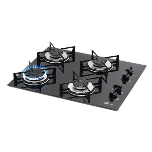 Cooktop Fischer a gás com 4 queimadores, mesa de vidro temperado, acendimento superautomático, trempes individuais e design moderno.Luz de calor residual
