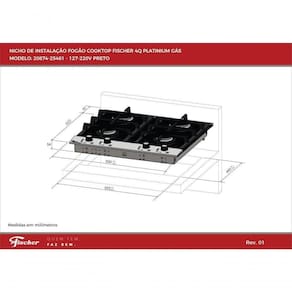 Características gerais Marca Fischer Linha Platinium Modelo 20874 Outros Materiais da superfície Vidro Eficiência energética B Dimensões Largura x Profundidade x Altura 59 cm x 52.2 cm x 13 cm Especificações Tipos de alimentação Gás Tipo de gás Engarrafado Tipo de ignição Automático Tipo de controle Botões Quantidade de bocas 4 Outros Tipo de montagem De embutir É conversível a gás natural Sim Peso 14.15 kg