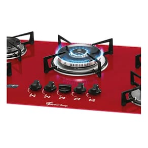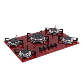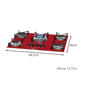Mesa em vidro temperado Rouge (vermelho) - resistente, sofisticada e fácil de limpar. 5 queimadores de alta performance, sendo 1 Tripla Chama de 3700W. Acendimento superautomático. Trempes individuais em aço carbono esmaltado EasyClean.Luz de calor residual