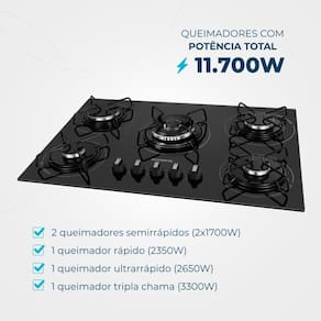 O Cooktop a Gás 5 Bocas Tripla Chama CTG-03 da Mondial garante mais potência e rapidez no preparo dos alimentos. Possui mesa de vidro temperado, com melhor disposição e aproveitamento entre as bocas e 5 queimadores com potência total de 11.050w, sendo 1 queimador Tripla Chama. Os botões são removíveis, têm detalhamento em aço inox, e o acendimento das chamas é automático. Aproveite a qualidade que só a Mondial oferece!
