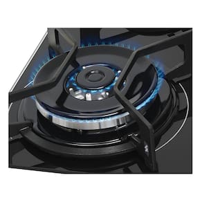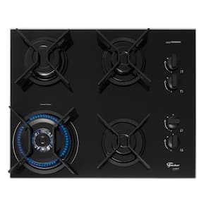 Cooktop a Gás Fischer 4 Bocas Fit Line Tripla Chama Trempe Iron com mesa em vidro temperado preto, trempes Iron esmaltadas, acendimento superautomático e tripla chama de 3700W.Alimentação