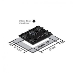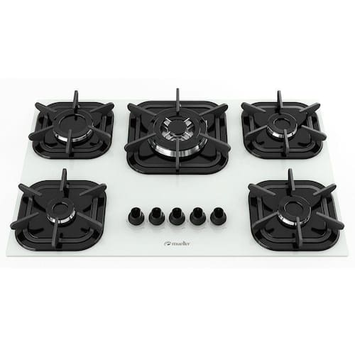 Cooktop Mueller com 5 bocas, queimador tripla chama, acendimento superautomático, grades individuais em ferro fundido, mesa em vidro temperado e queimadores em aço esmaltado.Luz de calor residual