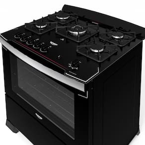 São 5 bocas com acendimento automático, sendo que 1 delas traz o poder da tripla chama. Já a mesa é de vidro temperado, conta com grades em ferro fundido e botões removíveis. Além disso, o forno é tamanho família são 100 litros de capacidade, 2 prateleiras sendo 1 deslizante, e outra auto deslizante, vidro duplo e puxadores de alumínio. Tudo isso, aliado ao acabamento limpa fácil. Assim, você faz as melhores receitas, acompanha cada detalhe de perto e ainda deixa tudo organizado rapidamente.