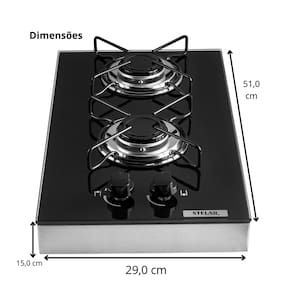 Marca: Stelar Modelo: Euro 2Q Cor: Preto Tipo de Instalação: De Bancada Tipo de Funcionamento: A Gás Tipo de Gás: GLP Número de Queimadores: 02 Potência dos Queimadores: 2 Rápidos (2000W) Acendimento: Manual Material/Composição: Vidro Temperado e Aço Esmaltado Suporte da Trempe: Aço revestido com Teflon preto Produto Nacional: Sim Dimensões e Peso: