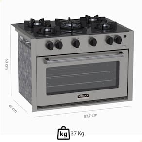 O modelo Gaudi Line Inox se destaca pelo design moderno com mesa de vidro, acendimento automático, porta de vidro espelhado, puxador de aço e forno com luz interna. Além disso, oferece temperatura ajustável de 180C a 290C e tem válvula de segurança para maior proteção.