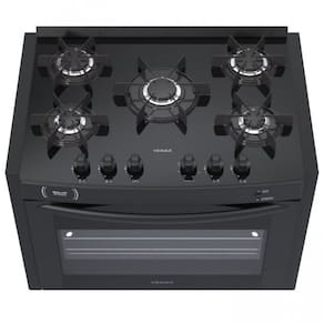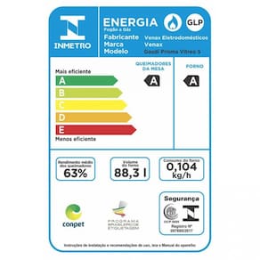 Características técnicas: Acendimento: Automático Queimadores: 3 Grandes e 2 Médios Trempe dos Queimadores: Individual Esmaltada Mesa Queimadores: Vidro Preto Base das Trempes: Esmaltada na cor Preto Botões: Removíveis Válvula de Segurança: Sim Luz no Forno: Sim -Lâmpada não acompanha o produto- Prateleiras do Forno: Duas Auto Deslizantes Revestimento do Forno: Esmalte Easy Clean Temperatura: 5 posições de 180°C Até 290°C Função Grill: Não Timer Grill: Não Timer Gás: Não Espeto Giratório: Não Bandeja Coletora de Resíduos: Não Porta Removível: Sim Porta do forno: Vidro Panorâmico com Base Lateral Vidro Duplo na Porta: Sim Puxador da Porta: Aço na Cor do Produto Entrada de Gás: Uma Entrada-Lado Esquerdo Visto de Frente- Alimentação: Gás GLP -A conversão para Gás Natural não é coberta pela garantia- Frequência: 50/60Hz Classificação Energética: A Etiquetas: ENCE e CONPET Potência do Queimador do Forno: 3,30kW Potência Queimadores Mesa: 1,80kW -Queim.Grande-; 1,35kW -Queim.Médio- Dimensões Internas do Forno-LxPxA-: 648x470x290 -mm- Volume do Forno: 88,3L