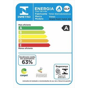 Alimentação: Gás GLP (A conversão para Gás Natural não é coberta pela garantia) Tensão: Bivolt Frequência: 50/60Hz Classificação Energética: "A" Etiquetas: ENCE e CONPET Garantia: 1 Ano Potência Queimador: 1,35kW, (queim. Médio) 1,80kW (queim. grande) Ean: 7899552105324