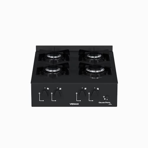 Fogão de mesa portátil com 4 bocas, trempes esmaltadas, mesa de vidro preto, acendimento automático e alimentação a gás GLP.Luz de calor residual