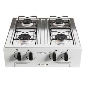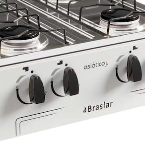 Características: Fogão Marca: Braslar Modelo: Asiático Júnior Origem: Nacional Quantidade de bocas: 4 Bocas Acendimento: Manual Material da mesa: Aço inox Funcionamento: GLP - A conversão para GN precisa ser adaptada, conforme consta no manual do produto Potência dos queimadores: Família: 7,5 kW Eficiência energética: A Manípulos removíveis: Sim Tampa de vidro: Não Timer: Não Relógio: Não Termostato: Não