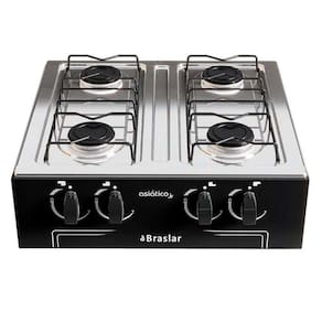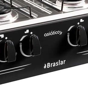 Características: Fogão Marca: Braslar Modelo: Asiático Júnior Origem: Nacional Quantidade de bocas: 4 Bocas Acendimento: Manual Material da mesa: Aço inox Funcionamento: GLP - A conversão para GN precisa ser adaptada, conforme consta no manual do produto Potência dos queimadores: Família: 7,5 kW Eficiência energética: A Manípulos removíveis: Sim Tampa de vidro: Não Timer: Não Relógio: Não Termostato: Não