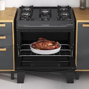 Características Adicionais: Trempes com 6 apoios e acabamento fosco para maior estabilidade das panelas Puxador em aço Acendimento automático Top Control na mesa de vidro com manípulos que sinalizam a potência ideal para cada receita. Manípulos removíveis
