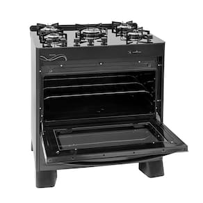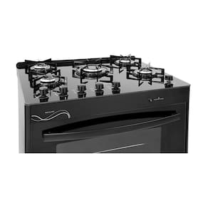 DADOS TÉCNICOS: - Voltagem: Bivolt - Cor: Preto - Quantidade de bocas: 5 Bocas - Acendimento: Automático - Tipo de mesa: Vidro temperado - Instalação: Fogão de piso - Capacidade do forno: 90L - Tampa: Não - Grades do forno: 1 grade e 3 níveis de ajuste no forno - Botões Removíveis: Sim - Tipo de gás: GLP - Trempes: Aço esmaltado brilhante com 6 pontos de apoio - Medidas do fogão (AxLxP): 92x76,5x64,3cm - Peso: 30,5 Kg - Garantia: 12 meses