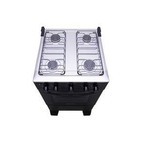 Possui mesa em inox, tampa de vidro na mesa, grades duplas de aço esmaltado, acendimento automático e botões removíveis, facilitando na hora da limpeza.