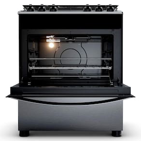 Fogão de piso 5 bocas com turbo chama e grill. Mesa de aço inox, trempes individuais, forno com alta capacidade e função grill.Demonstração 360º