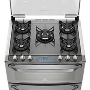 Características: Modelo: 76DXW Tipo: Piso Quantidade de Bocas: 05 Quantidade de Fornos: 02 Capacidade dos Fornos: 94,5L inferior / 38,8L superior Tipo de Acendimento: Automático Tipo de Queimadores: Tripla chama, queimadores selados Tipo de Gás: GLP Painel: Blue Touch Grill Elétrico Timer: Digital Luz no Forno Lâmpada Inclusa: Não Botões Removíveis Prateleiras Reguláveis e Deslizantes Painel da Mesa com Grafismo a Laser Puxador Ergonômico Bloqueia Gás Funcionamento: a Gás Selo Procel (Eficiência Energética): A Selo Conpet (Eficiência Energética): A