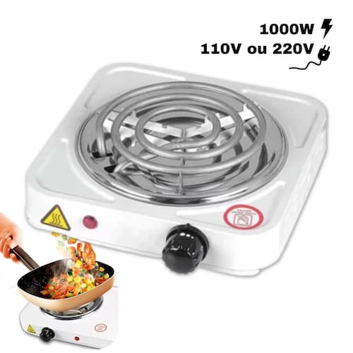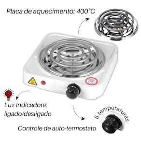 Características do Produto: 1.Potência: 1000w 2.Tensão: 220v 60hz 3.Placa única; 4.Tamanho da placa de Aquecimento: diâmetro - 144mm 5.Luz indicadora de Funcionamento: ligado/desligado; 6.Controle de Auto-termostato - 5 temperaturas; 7.Operação de calor; 8.Espessura: 0,35mm; 9.Atenção: apenas para Uso interno; 10.Cor: branco; 11.Tamanho do produto: 20x20x7cm ; 12.Plug do brasil; 13. Sem polifoam