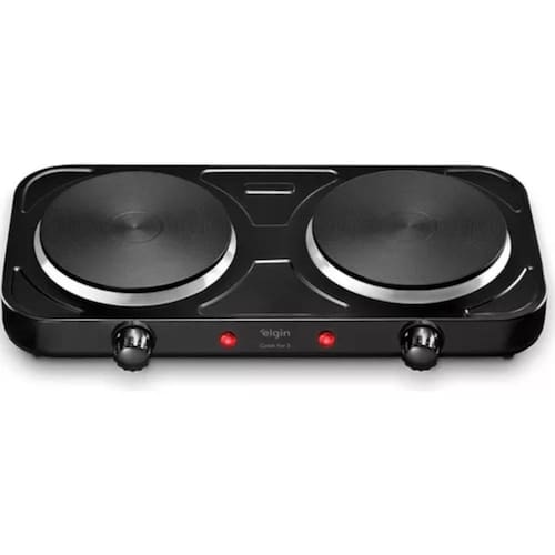 Fogão elétrico portátil com 2 bocas, controle individual de temperatura e design compacto.Alimentação