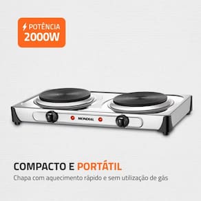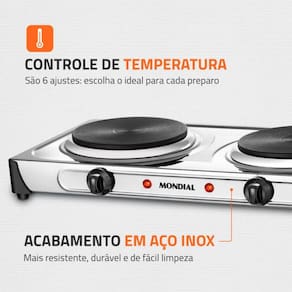 Prepare deliciosas receitas, com praticidade, em qualquer lugar! O Fogão Elétrico Fast Cook Dual Mondial possui duas chapas com aquecimento rápido e sem utilização de gás, totalizando 2000W de potência. Conta com 6 ajustes de temperatura para você escolher a ideal para cada tipo de preparo, como carnes, sopas, legumes e outros.