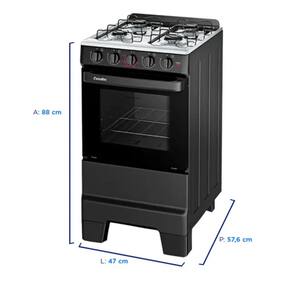 Com quatro queimadores, sendo um queimador família e três pequenos, o fogão oferece a flexibilidade necessária para diferentes tipos de preparo. A potência total de 8,85 kW garante eficiência ao cozinhar.