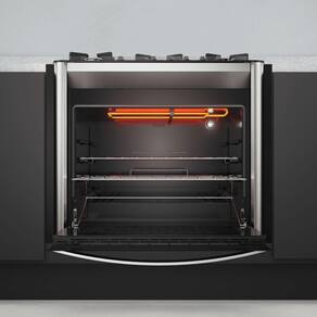 O forno, com capacidade para 110L, é um dos maiores da categoria e conta com uma porta de vidro duplo que impede a fuga de calor, proporcionando economia de energia e maior segurança durante o uso. O Grill Elétrico é perfeito para receitas com melhor aspecto, dourando e gratinando os alimentos e deixando-os ainda mais saborosos. Além disso, o fogão possui uma lâmpada interna que facilita a visualização dos assados, controle de temperatura do forno, porta com abertura ergonômica e acendimento automático total, seguro e sem riscos de queimadura.