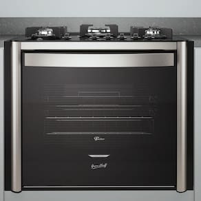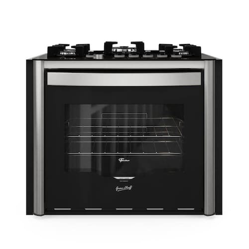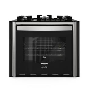 - Acabamento: Mesa de vidro temperado na cor preta; Suporte da trempe esmaltado em easy clean preto; Trempe individual; Manipuladores (botões) na cor preto removíveis; Fogão com 5 queimadores: 1 queimador tripla chama ( 3750W) 1 queimador rápido (2850W), 3 queimadores semirrápidos (1950W); Forno com 1 queimador (3500W); Potência elétrica grill/dourador: 1000W; Puxador em alumínio escovado anodizado; Laterais em aço pintado silver; Porta com vidro duplo serigrafado e amplo visor; Perfil frontal em aço pintado silver; Resistência interna do forno blindada; 2 Grades cromadas, ajustáveis, deslizantes e removíveis; Bandeja esmaltada para resíduos - removível; Corpo interno com revestimento especial easy clean de fácil limpeza.
