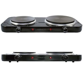 Fogareiro elétrico portátil com 2 bocas, potência total de 2500W (boca média 1000W, boca grande 1500W). Possui controle de temperatura independente por prato, luz piloto e resistência blindada. Funciona apenas com eletricidade, sem necessidade de gás. Ideal para uso doméstico e camping.Tipo